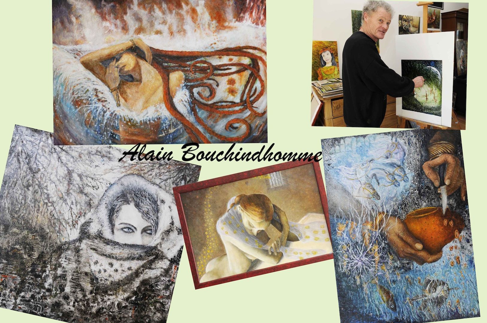 Alain Bouchindhomme peint des toiles au contenu très riche, presque comme des objets ou personnages cachés à découvrir. Les couleurs aussi sont agréables, enfin je vous laisse à votre propre avis... N' oubliez pas qu'en cliquant sur le montage vous pouvez largement agrandir cette image et mieux apprécier les toiles.